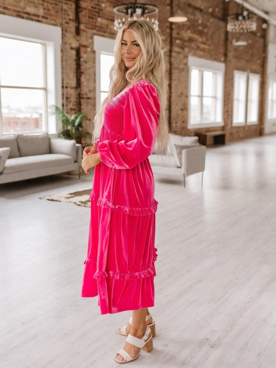 Turn heads and make a statement with the Blushing Pink Velvet Dress! Designed to elevate your style, this bold pink dress is sure to stand out. The luxurious velvet fabric adds a sense of opulence, while the elegant shirred detailing enhances your natural curves, creating a flattering and feminine silhouette.