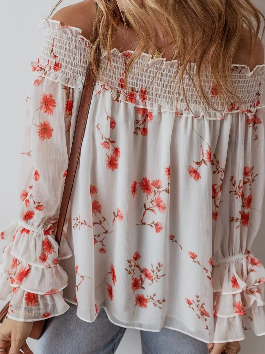 Unleash your inner daredevil with our Floral Charm Off The Shoulder Top! Embrace the bold off-shoulder style and delicate shirred detailing, exuding femininity and adventure. The vintage-inspired ruffled sleeves add a touch of romance. Made with airy 100% polyester, it offers a comfortable, loose fit perfect for any daring escapade.